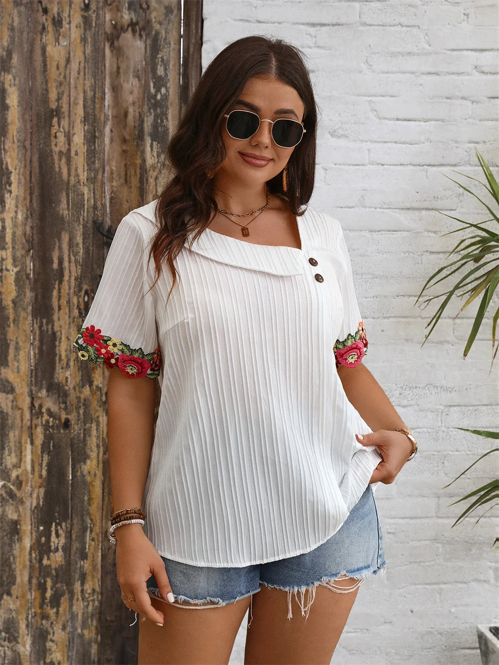 The Nora Plus Size Blouse is your go-to piece for effortless summer style. With its unique skew collar and delicate floral embroidery, this loose-fitting top combines comfort and elegance for any casual outing. Crafted from a soft polyester blend, it’s perfect for staying cool while looking chic.